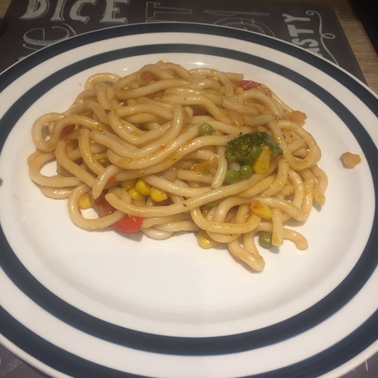 Ventured into the kitchen and made dinner: udon noodles, peppers, sweet corn, broccoli, peas and onion.