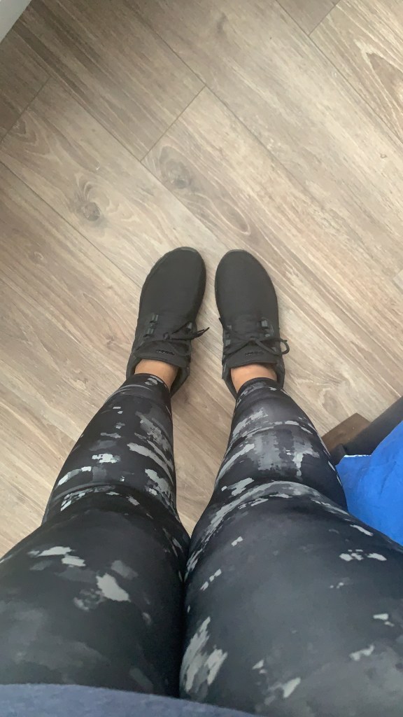 There she stands in running tights.