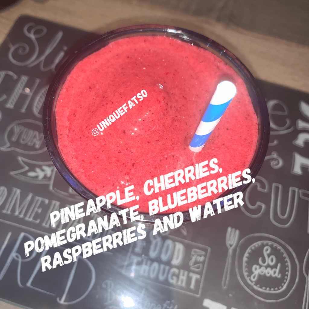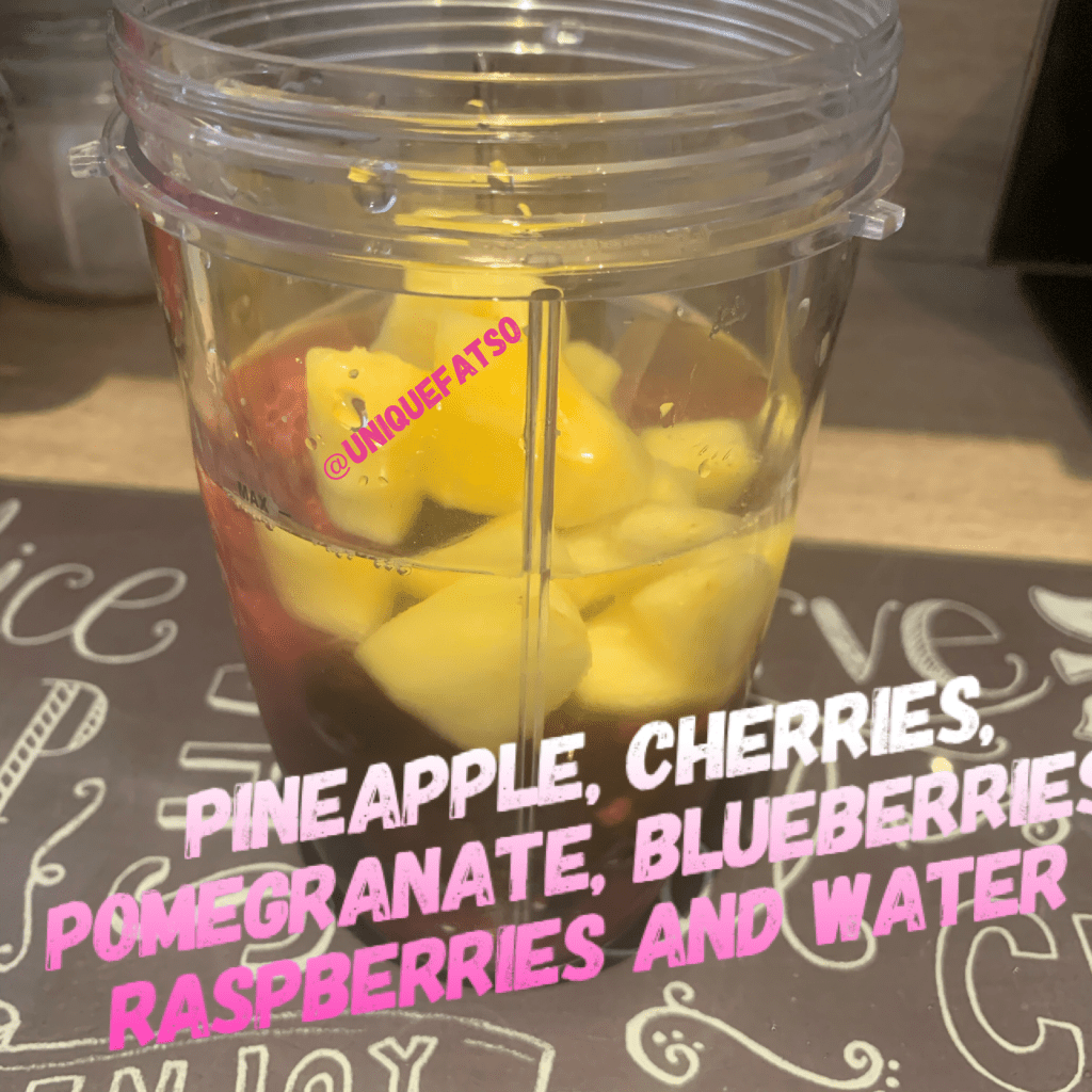 Pineapple, cherries, pomegranate, blueberries, raspberries and water. That’s all I needed to make breakfast the other day. All the fruits were washed, chopped and frozen – waiting to be selected for this healthy delight.
