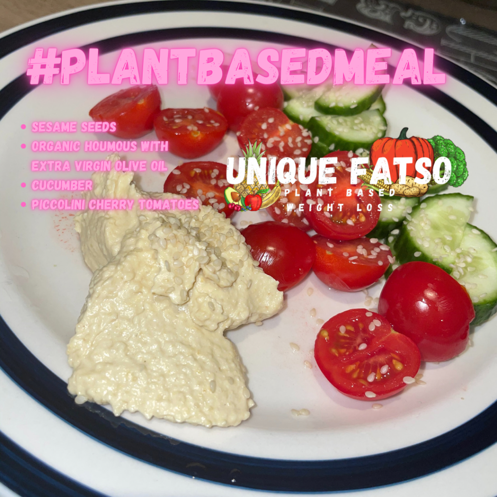 Plant Based Lunch: Organic Houmous with Extra Virgin Olive-Oil, Cucumber, Piccolini Tomatoes and Sesame Seeds